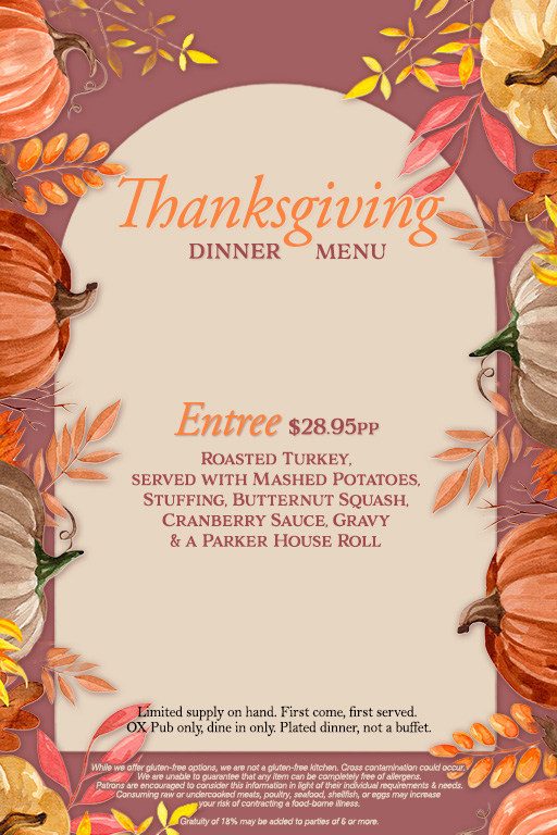 Join us for Turkey Dinner with all the fixings this Thanksgiving at OX Pub!